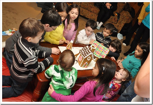 This year the guys thought that it would be fun to bring over the huge ginger bread house that Aunt Sarah had made, and watch the kids demolish it…