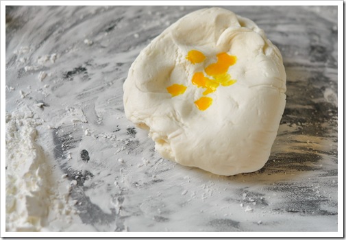 To colour it, start kneading and get it pliable and then add a few drop of food colouring on top. Keep kneading until the colour starts to mix in.